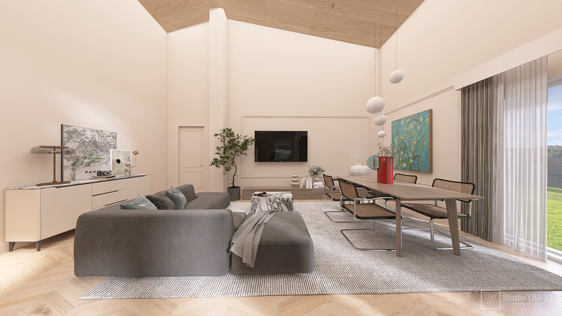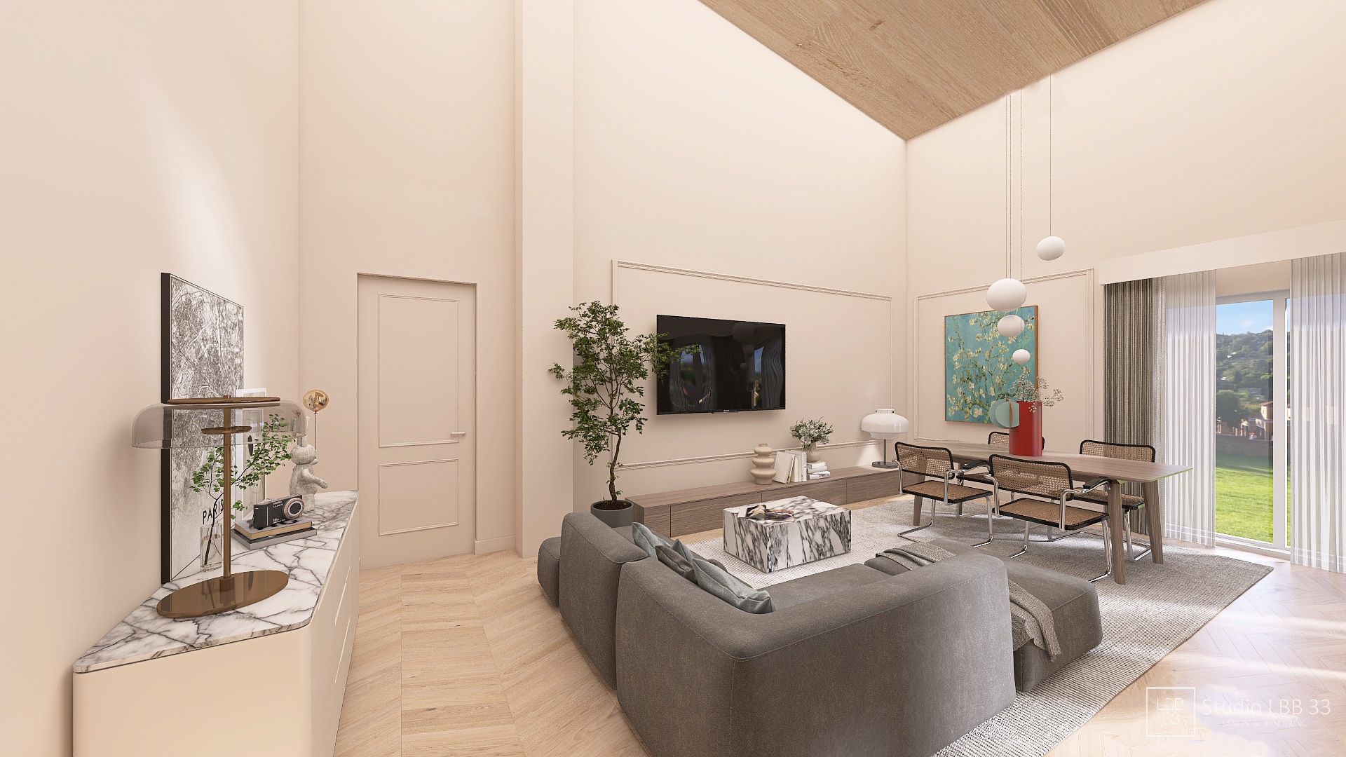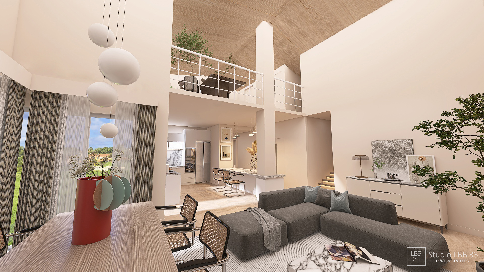 Progetto di interior design e valorizzazione architettonica di una villa su un unico livello con soppalco abitabile, doppio volume e finiture di pregio.